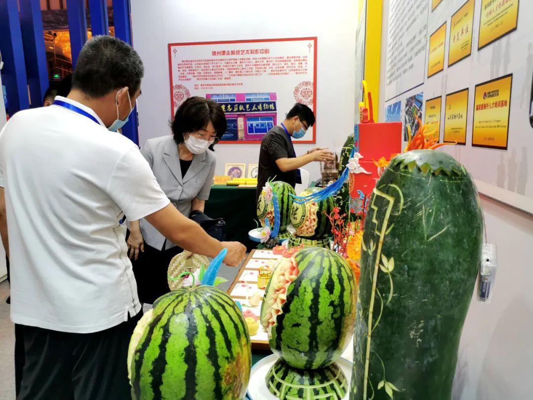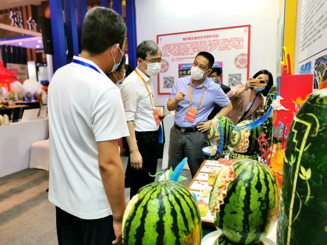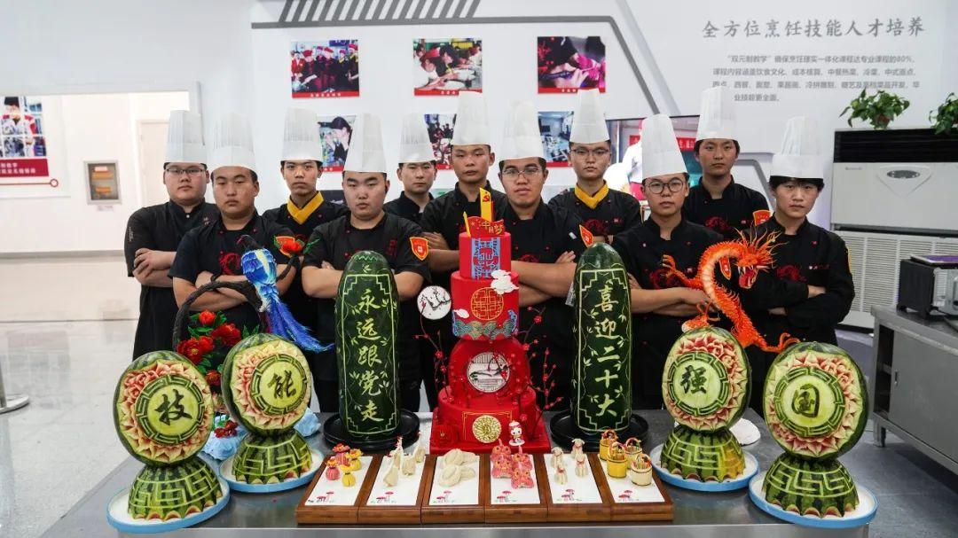 我校精心准备,以“技能强国,喜庆二十大”为主题,将果蔬雕刻、面塑、糖艺、中式面点、西点技能巧妙地融合进创意设计,作品个个造型生动、精致细腻、形态饱满、趣味盎然,在老师的指导下,全部由在校学生独立创作并制作完成。充分展示了四方学子精湛的技能水平,也得到了在场领导们的交口称赞。